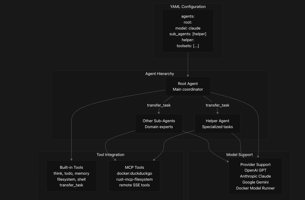 At its core, cagent operates on a hierarchical architecture where a "root agent" acts as a coordinator, intelligently delegating tasks to specialized sub-agents. Each agent maintains its own isolated context, ensuring modularity and clean separation of concerns—a crucial advantage for complex, multi-step workflows.