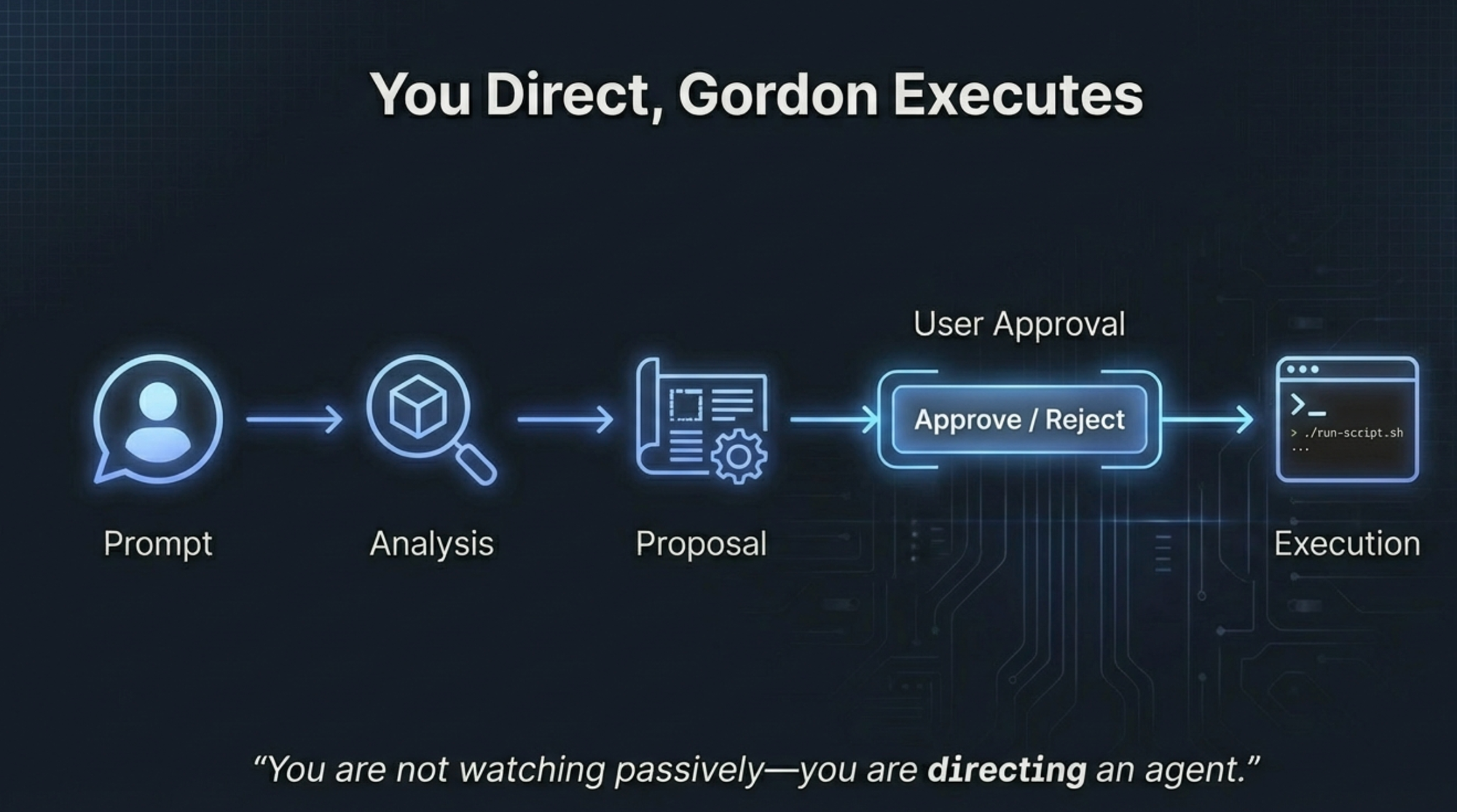 Every action Gordon wants to take — every shell command, every file edit, every Docker operation — requires your explicit approval. You see exactly what it plans to do before it does it. This isn't an afterthought; it's the core permission model.