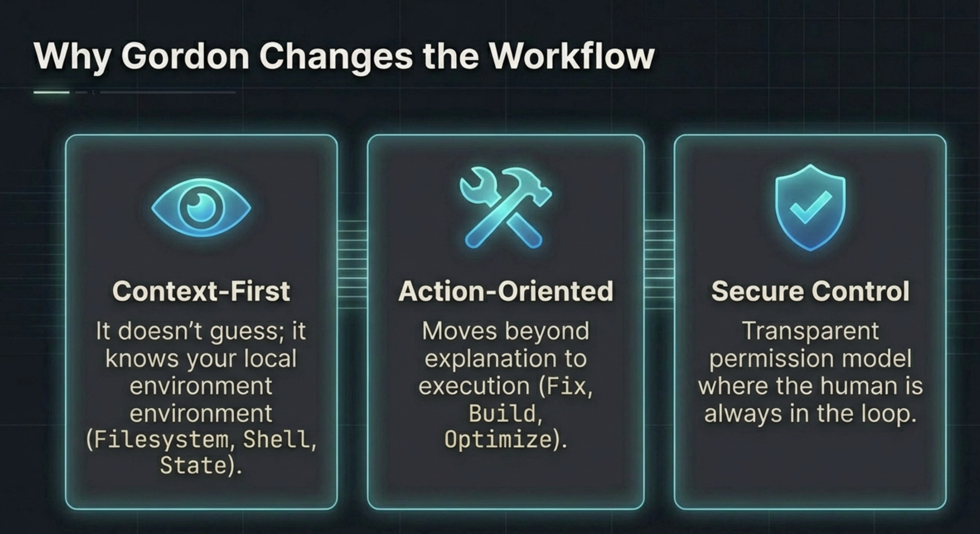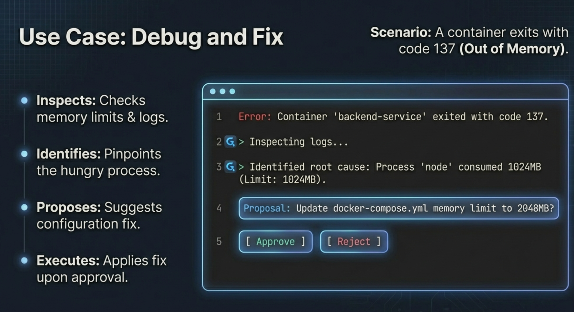 This is the fundamental shift. When you ask a general AI about an OOM kill (exit code 137), it explains what OOM means. When you ask Gordon, it checks your container's actual memory limit, reads your local logs, identifies which process is eating memory, and hands you a fix to approve.