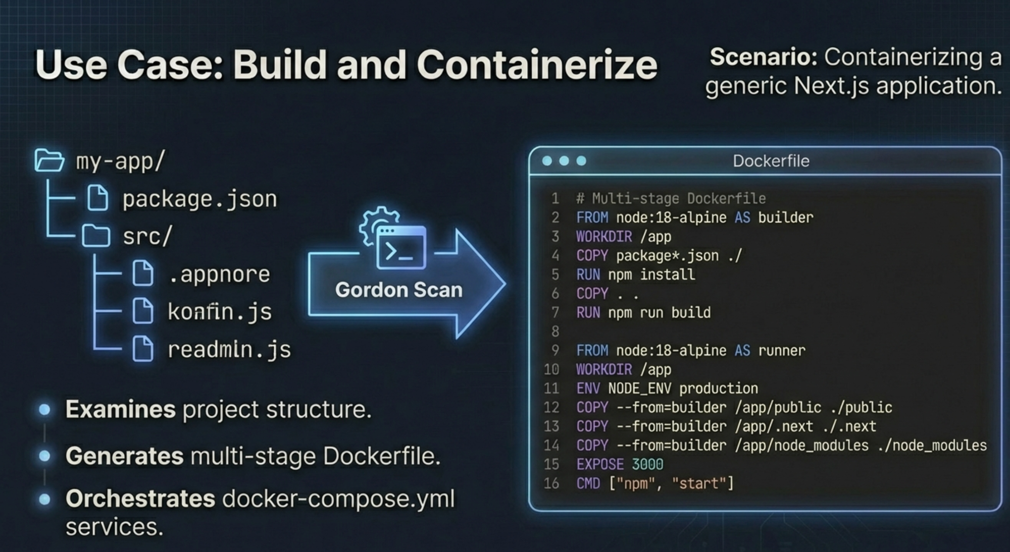 The same applies to containerizing applications. Instead of generating a generic Dockerfile template, Gordon examines your actual project structure — your package.json, your dependencies, your existing configs — and produces a production-ready Dockerfile with multi-stage builds and a matching docker-compose.yml.