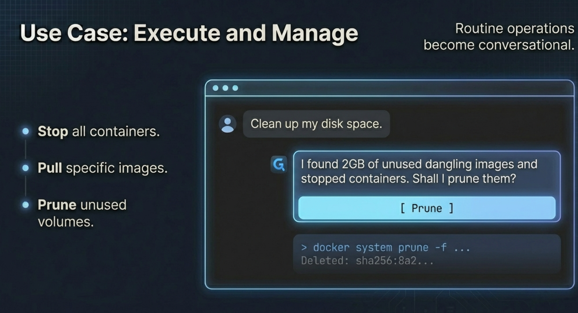 - Execute and Manage — Handles routine ops like cleanup, stopping containers, pulling images — all conversational