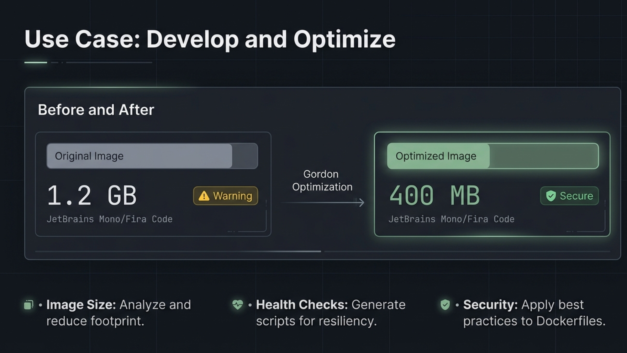 - Develop and Optimize — Adds health checks, implements multi-stage builds, applies security best practices, shrinks image sizes
