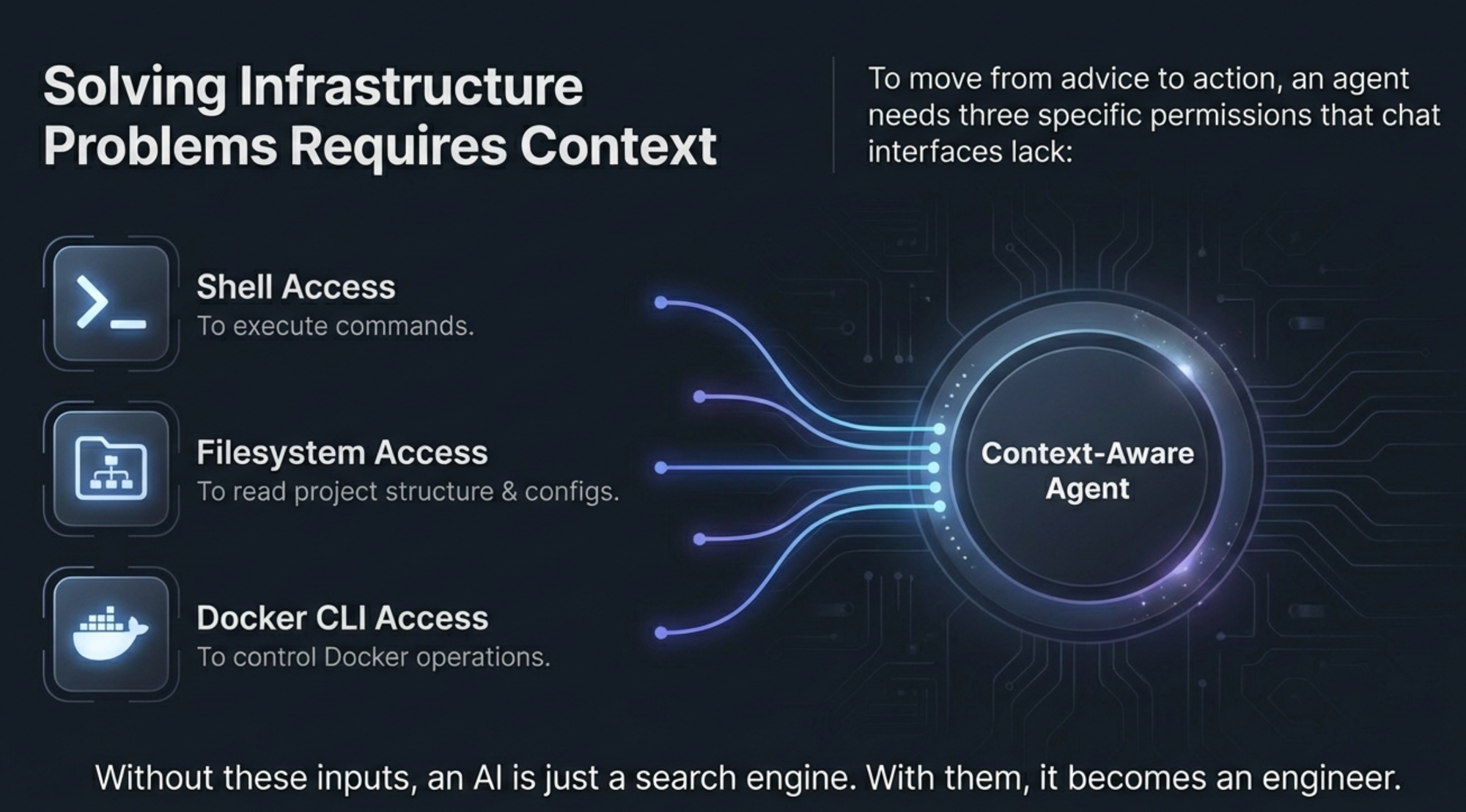 This is especially powerful for Docker because container management involves so many moving parts — images, volumes, networks, compose files, environment variables, health checks, security configs. Having an agent that understands all of these in the context of your specific setup changes the workflow entirely.
