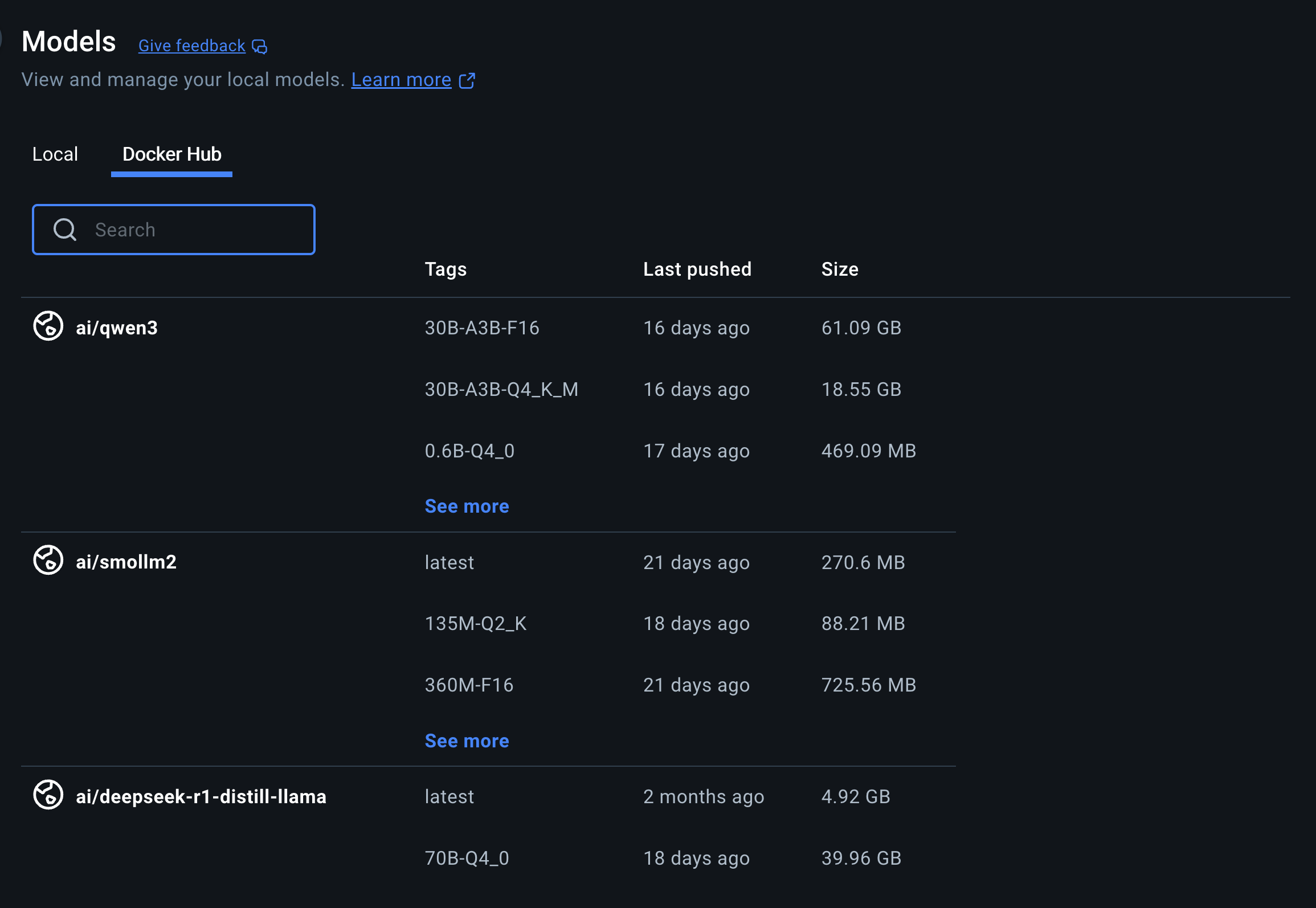 - Click “Docker Hub” and search for your preferred AI Model.