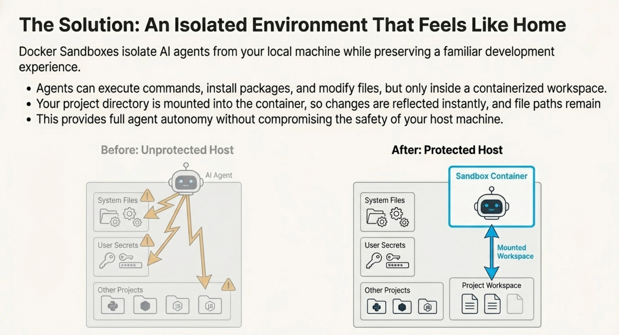 Docker Sandboxes solves these problems by isolating AI agents from your local machine while preserving a familiar development experience