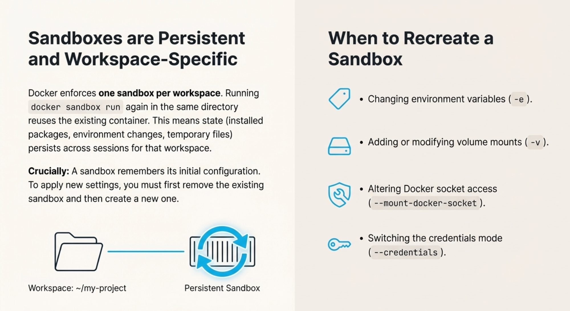 Docker enforces one sandbox per workspace. Running docker sandbox run again in the same directory reuses the existing container. This means: