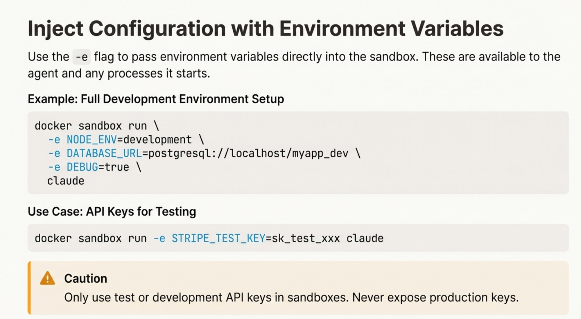 docker sandbox run -e STRIPE_TEST_KEY=sk_test_xxx claudeβ οΈ Caution: Only use test or development API keys in sandboxes. Never expose production keys.