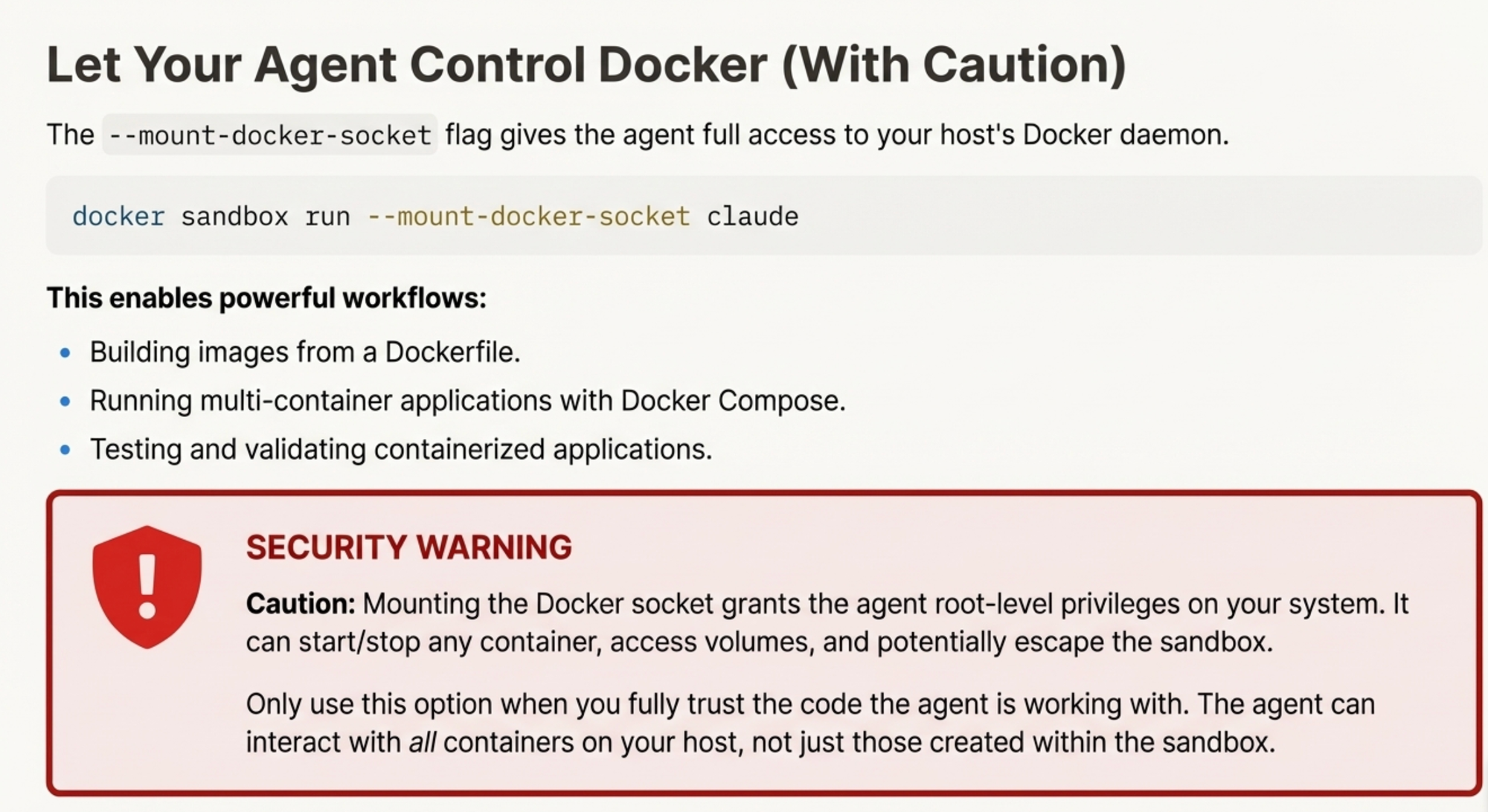 docker sandbox run --mount-docker-socket claudeβ οΈ SECURITY WARNING