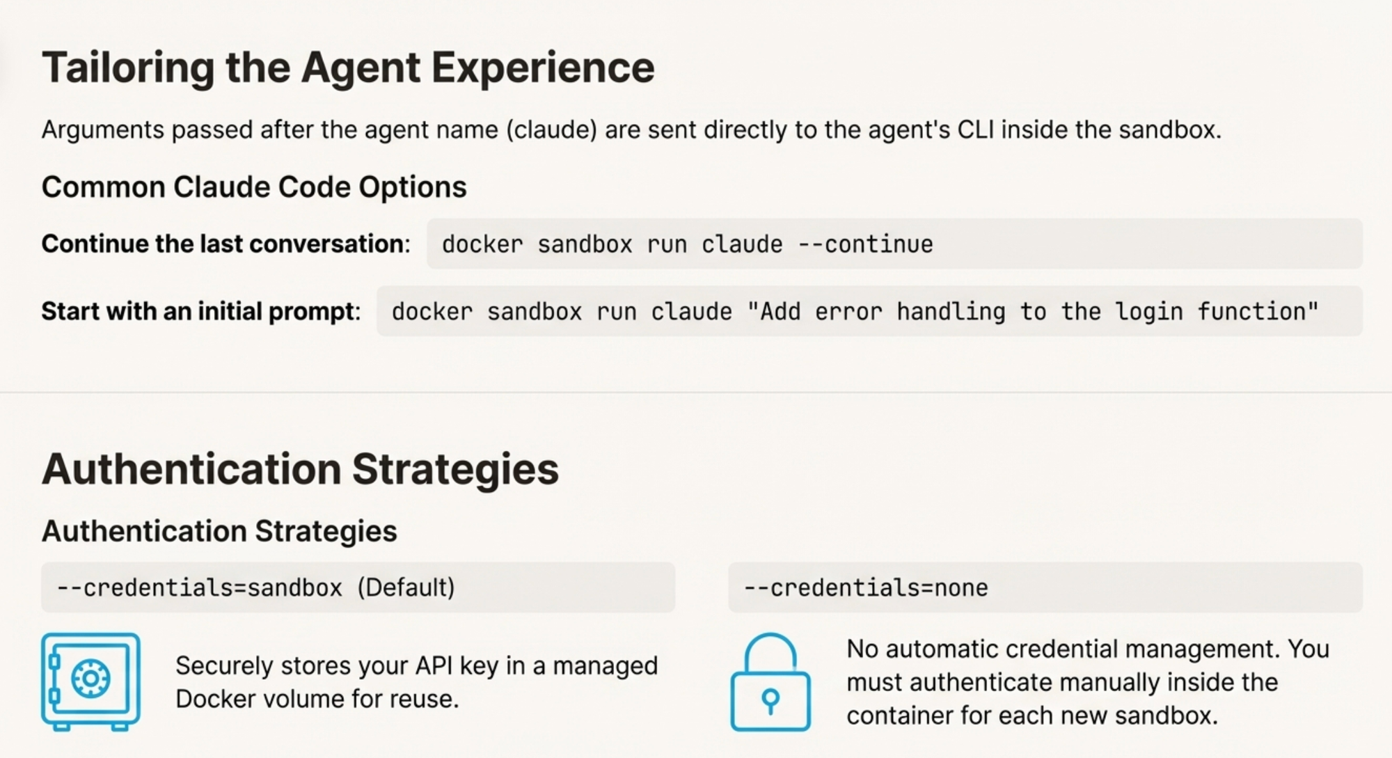 docker sandbox run claudeThat's it! On first run, you'll be prompted to authenticate. Credentials are securely stored in a persistent Docker volume for future sessions.
