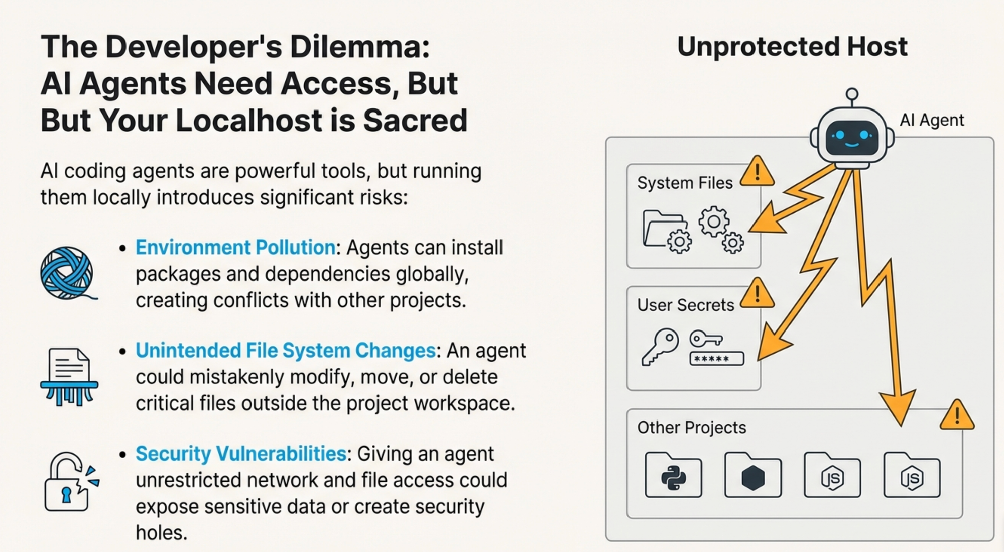 AI coding agents have become incredibly powerful. Tools like Claude Code, GitHub Copilot, and Devin AI can write code, debug issues, and even manage entire development workflows. But there's a critical problem: running them locally introduces significant risks.