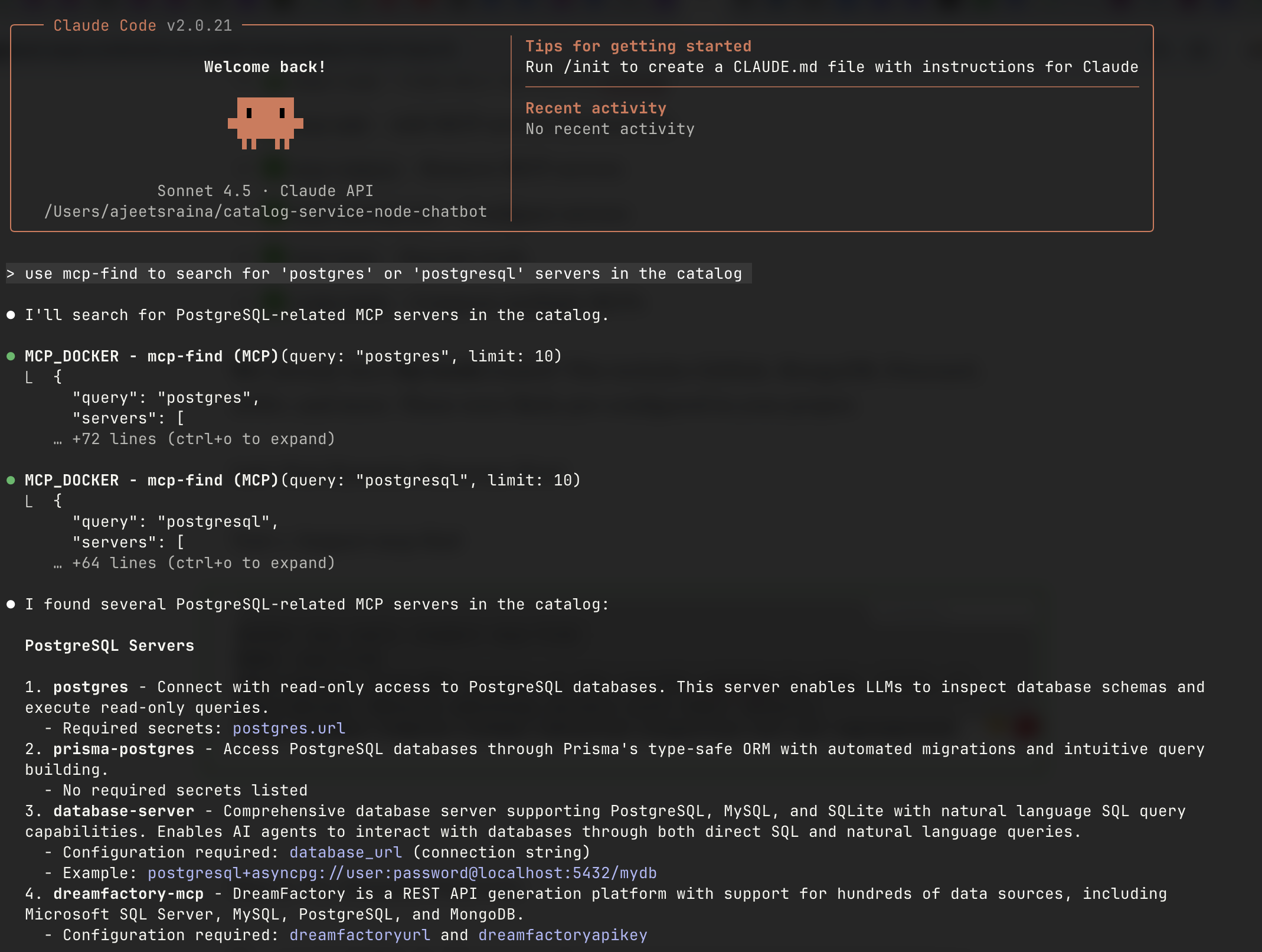 claude-code "use mcp-find to search for 'postgres' or 'postgresql' servers in the catalog"