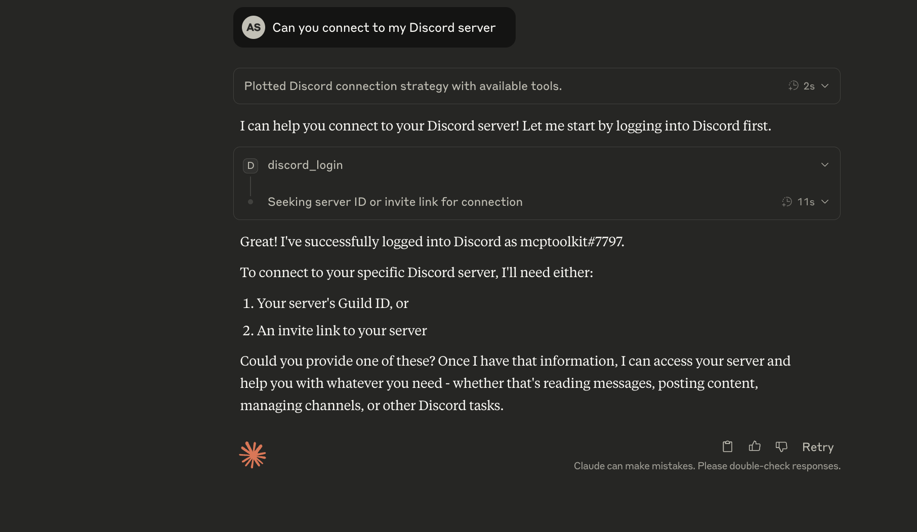 Once your MCP server is running, Claude can interact with your Discord server through natural language commands. Here are practical examples: