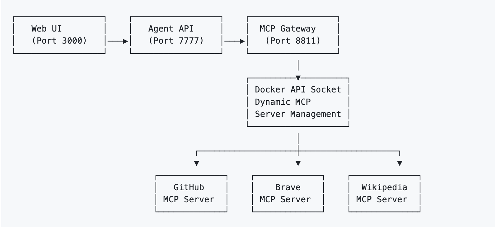 - All MCP servers run in isolated containers via Docker API socket