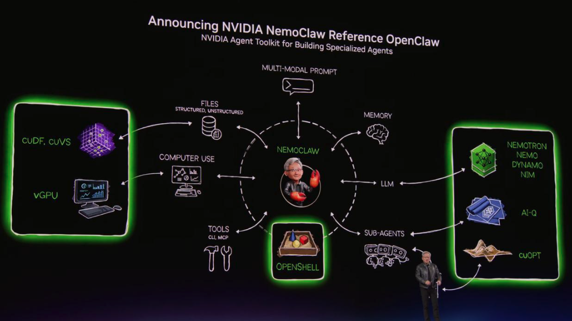 A large chunk of the keynote was dedicated to AI agents. Jensen heaped praise on OpenClaw — the viral agentic AI platform — and announced NVIDIA's enterprise-grade reference stack called NemoClaw, focused on making agents enterprise-secure without exposing proprietary data.
