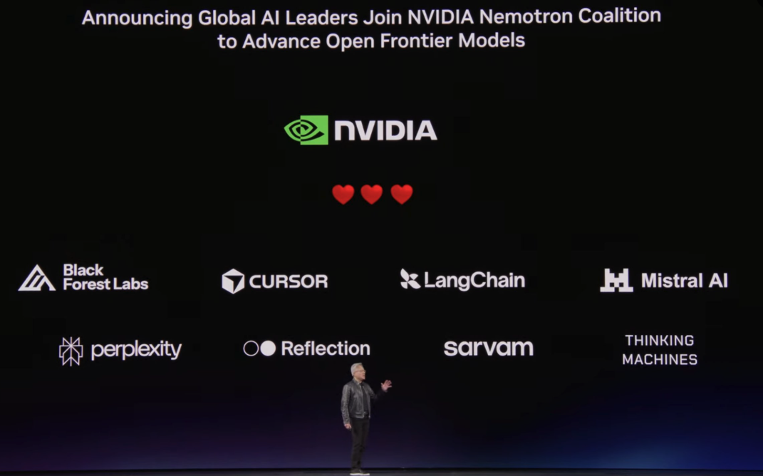 NVIDIA also announced the Nemotron Coalition — a group of open frontier model contributors including Perplexity, Mistral, Black Forest Labs, Cohere, and Reflection.