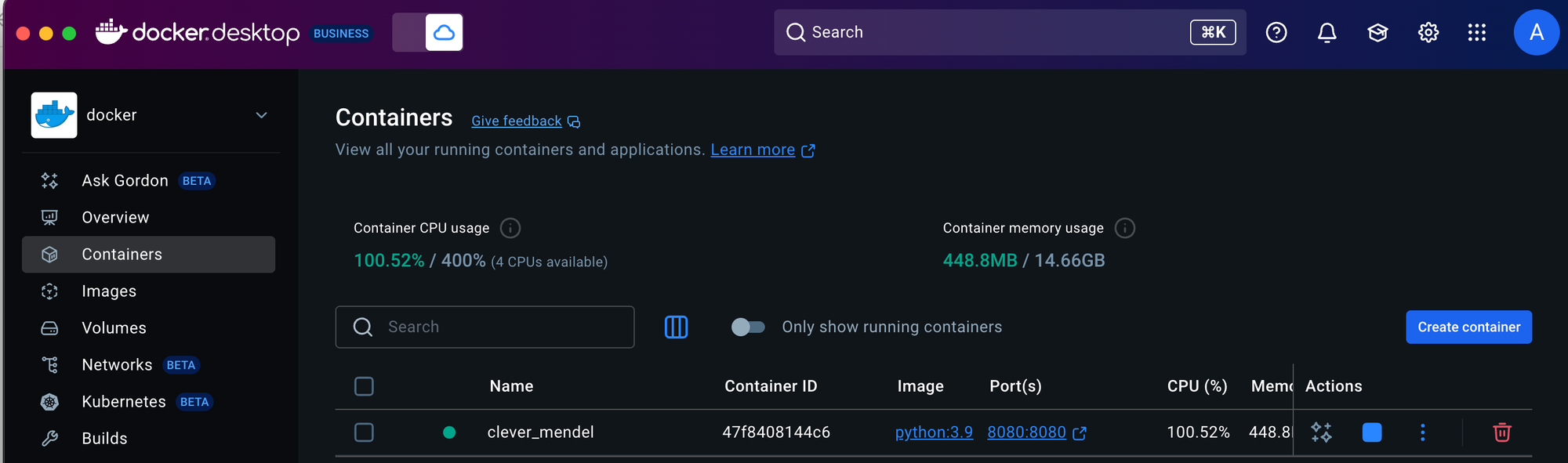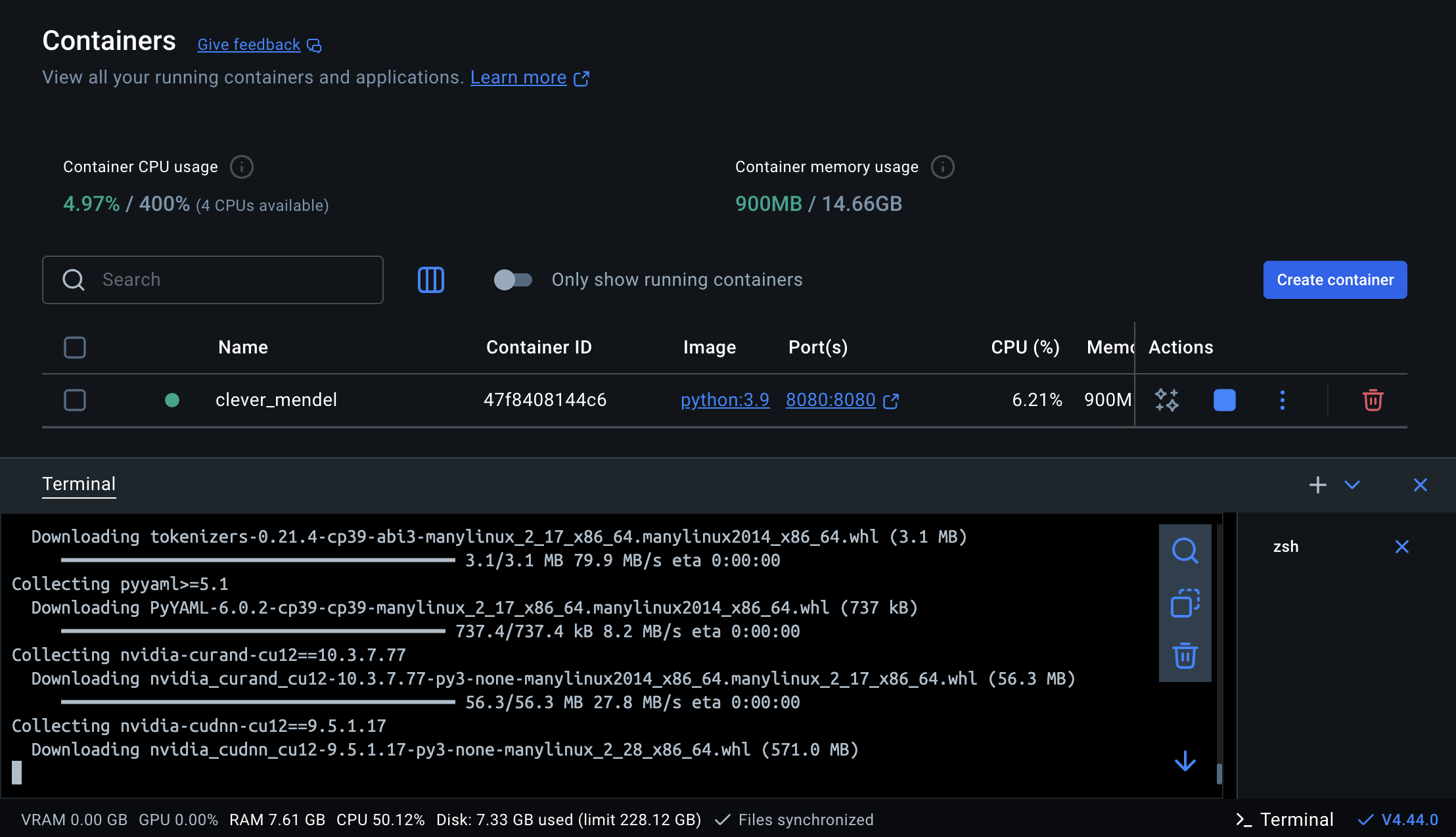 - Container Creation: Spins up a Python 3.9 environment with full GPU access