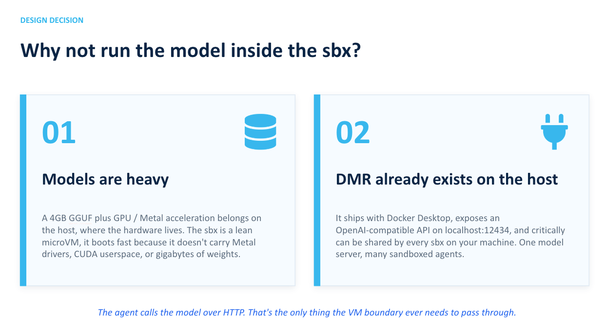- Models are heavy. A 4GB GGUF file plus GPU/Metal acceleration belongs on the host where the hardware lives. The sbx is intentionally a lean microVM ~ it boots fast because it doesn't haul around Metal drivers, CUDA userspace, or gigabytes of model weights.