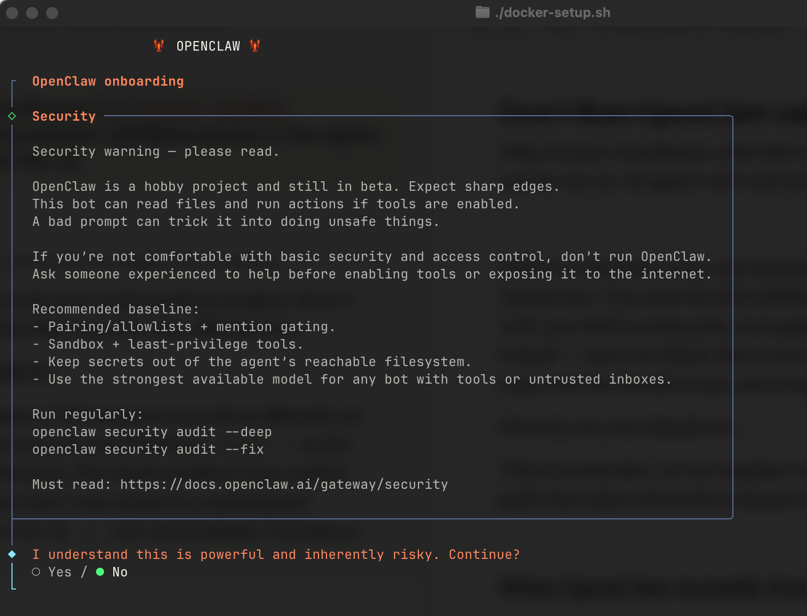 Running in Docker means the agent cannot access your host filesystem outside of the mounted volumes. This is a significant safety advantage over running directly on your machine.