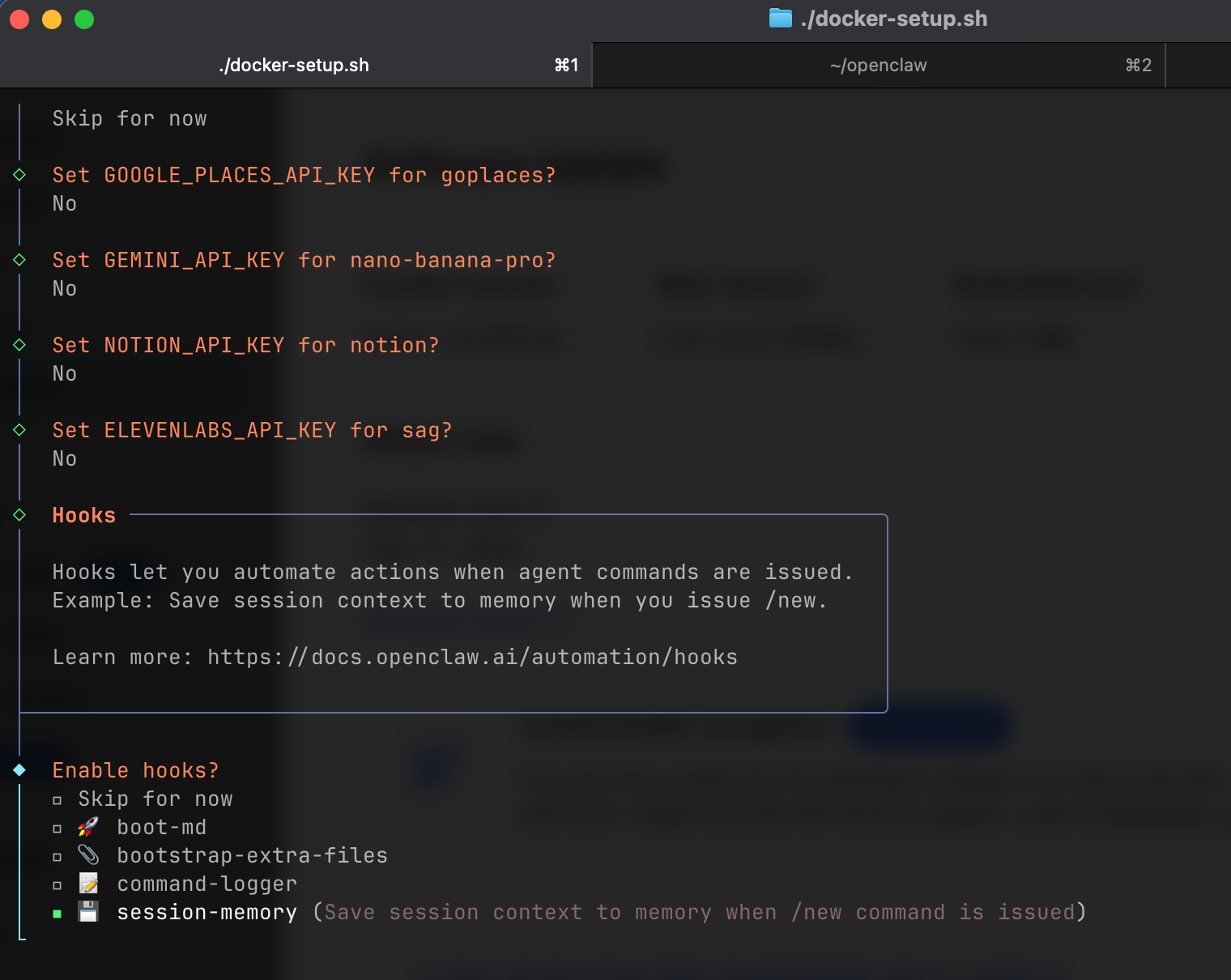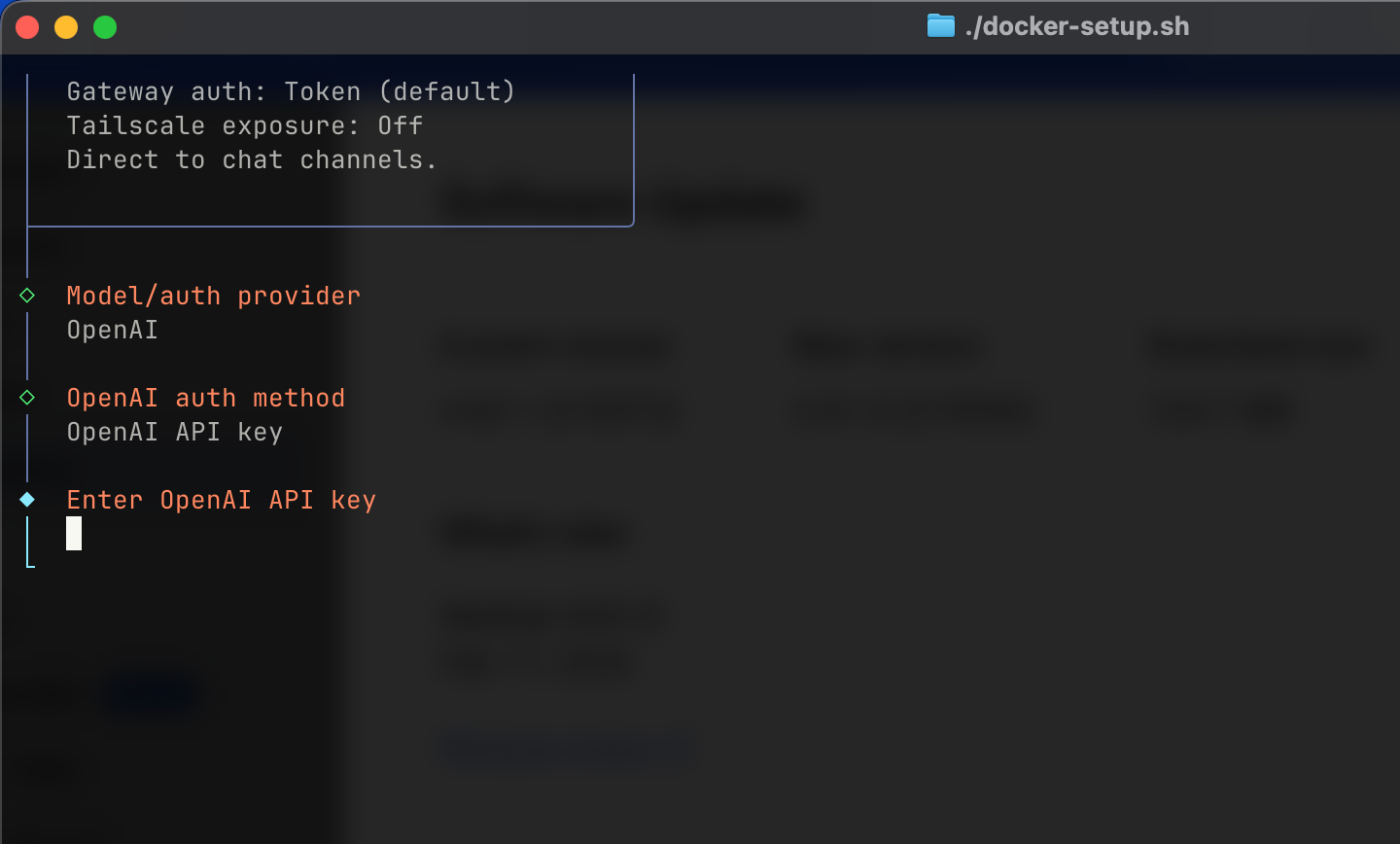 You can provide API keys during the onboarding wizard, or set them as environment variables in your Docker Compose configuration.
