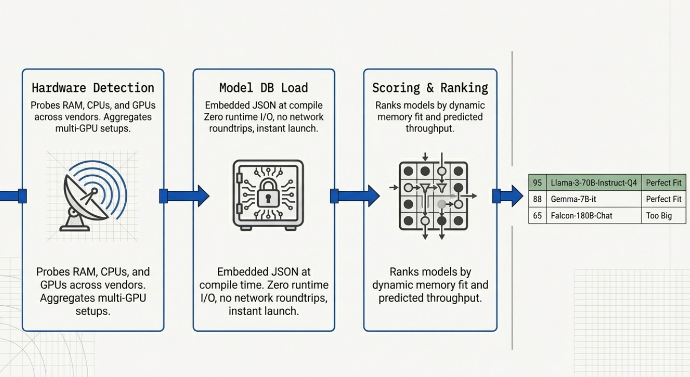 llmfit executes three sequential stages every time you run it: