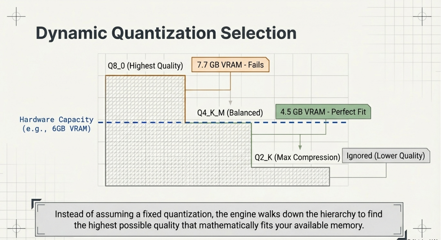 One of llmfit's most practical features is its dynamic quantization selection. Rather than assuming you want Q4 or Q8, it computes memory requirements across the full quantization hierarchy — from Q8_0 (highest quality) down to Q2_K (smallest size) — and selects the best quantization your hardware can run for each model.