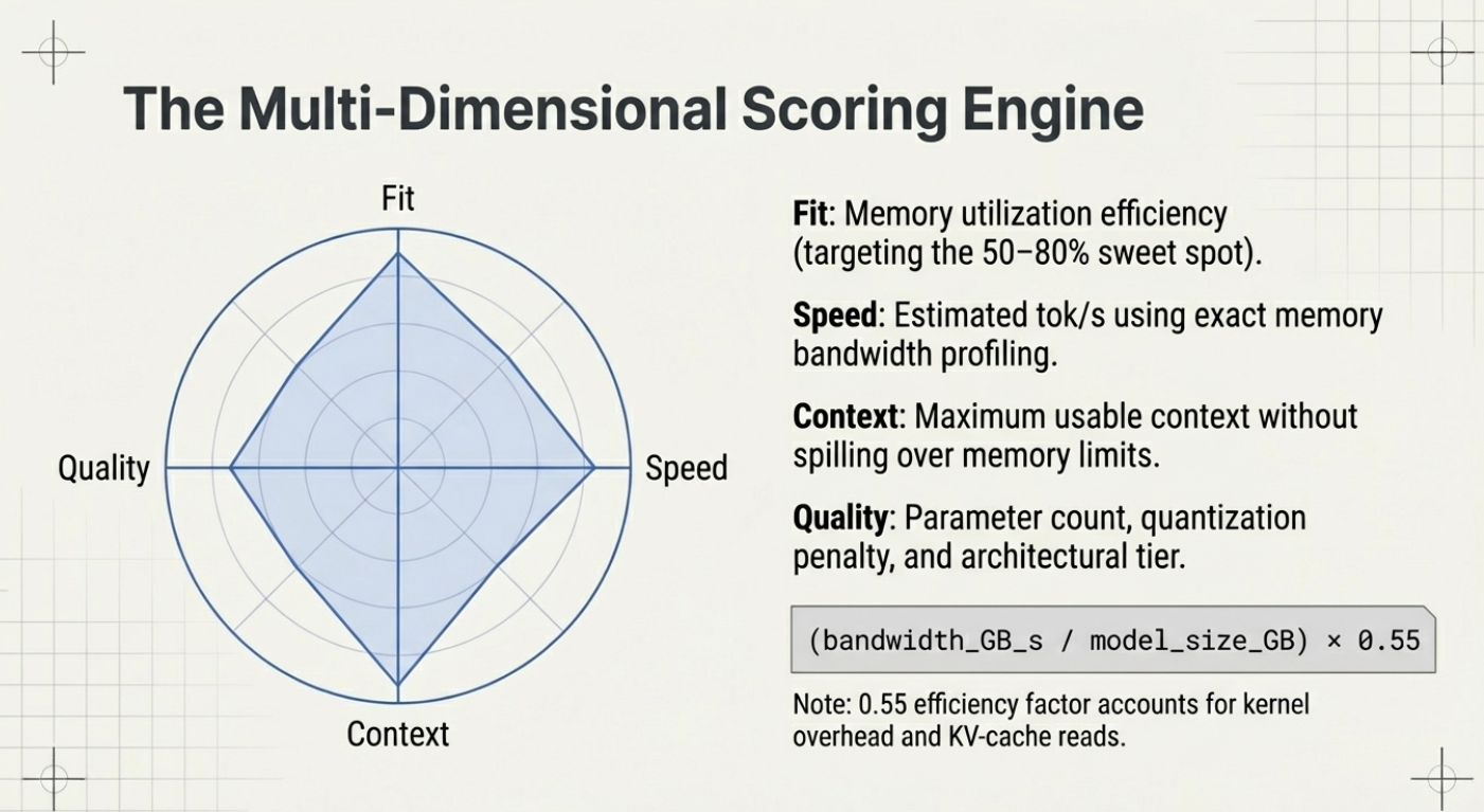 The heart of llmfit is its composite scoring system. Each model receives a score across four orthogonal dimensions: