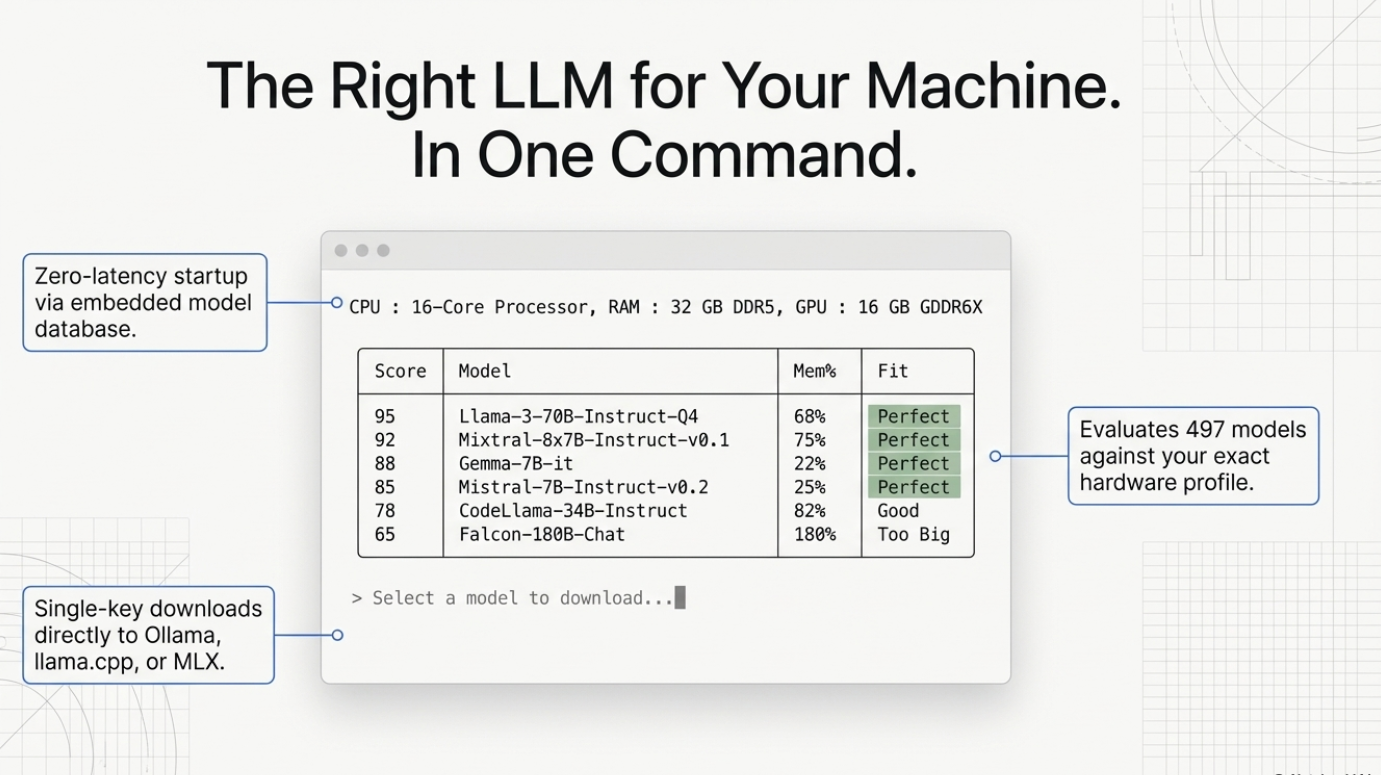 Stop guessing. Start running. llmfit picks the right LLM for your hardware.