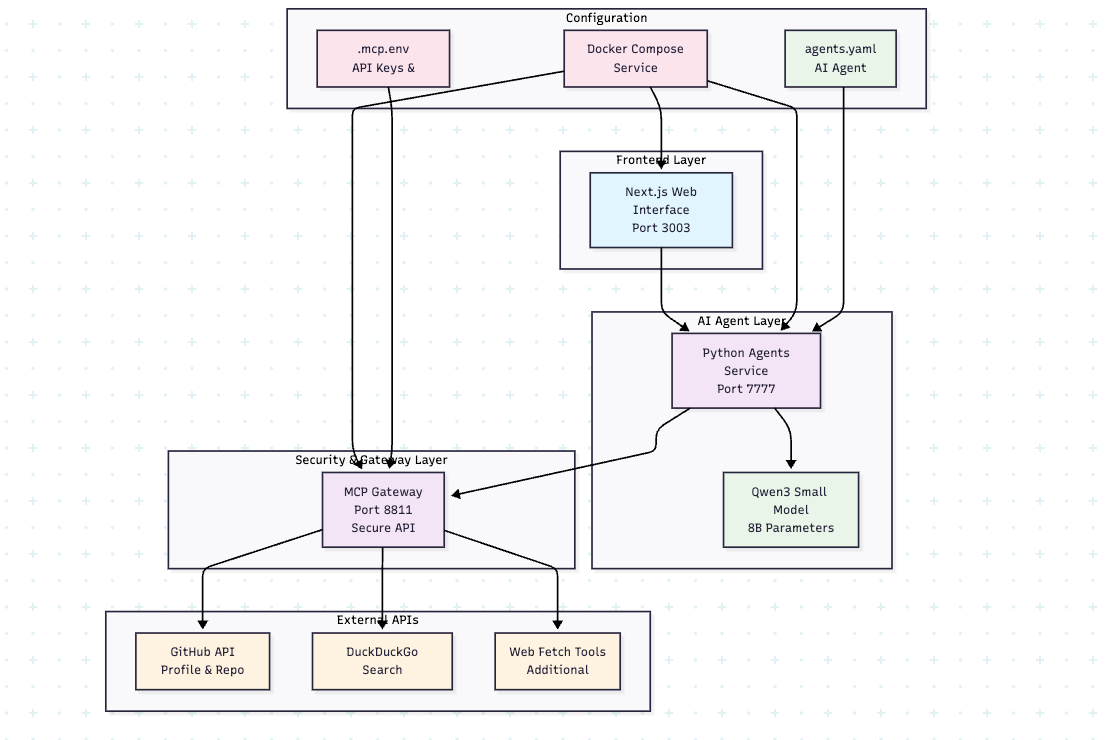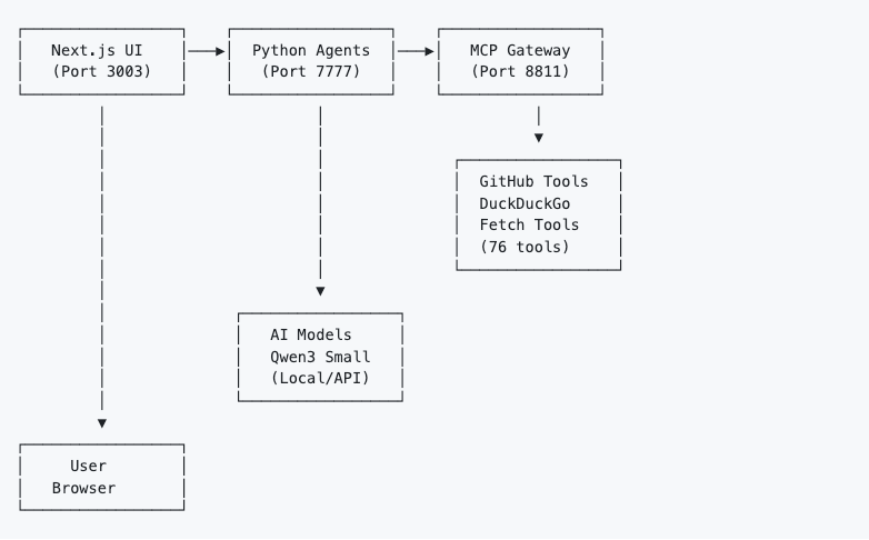 Next.js Frontend → Python AI Agents → MCP Gateway → GitHub/External APIsWhat's under the hood: