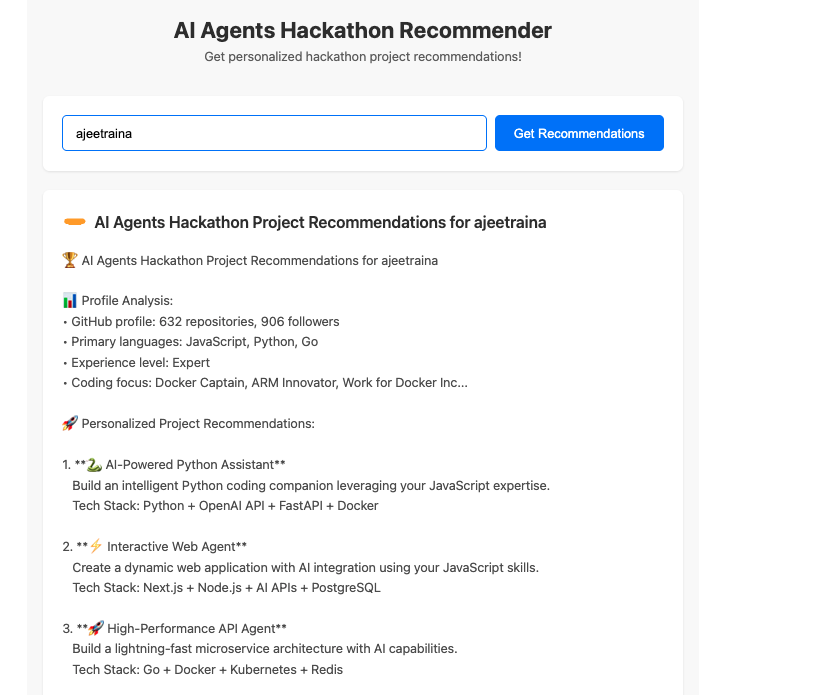 Meet the AI Agents Hackathon Project Recommender – an intelligent system that analyzes your GitHub profile and generates personalized hackathon project recommendations tailored to your actual skills, interests, and coding patterns.