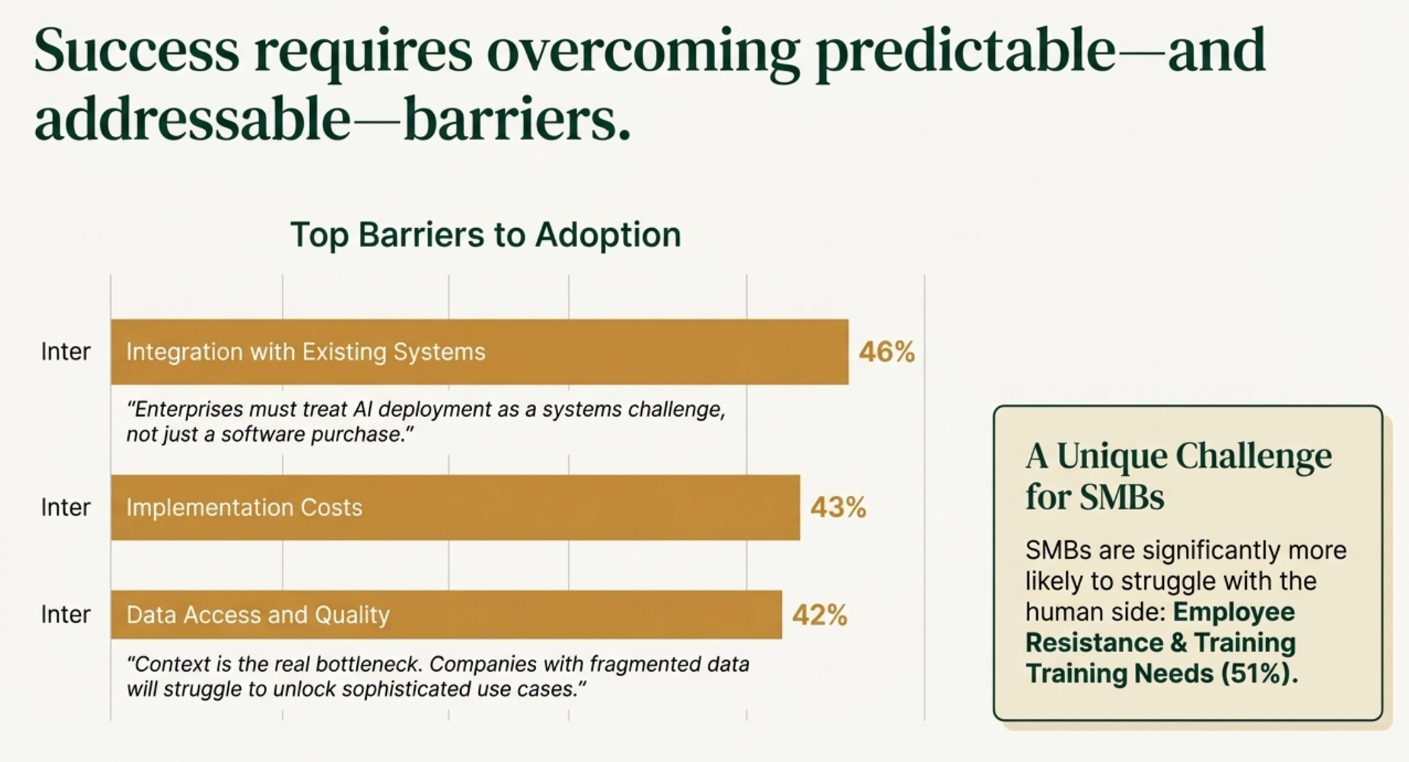 Survey respondents pointed to integration with existing systems (46%) and data access and quality issues (42%) as the primary obstacles. Not model capabilities. Not cost. Not even resistance to change (though that's important too).