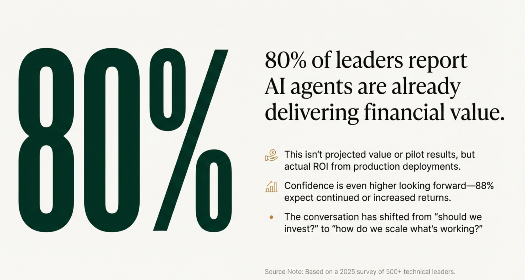 Here's the headline that should make every business leader sit up: 80% of organizations report that their AI agent investments are already delivering measurable financial returns. Not "we hope to see returns" or "our projections show." Actual, in-production ROI. Right now.