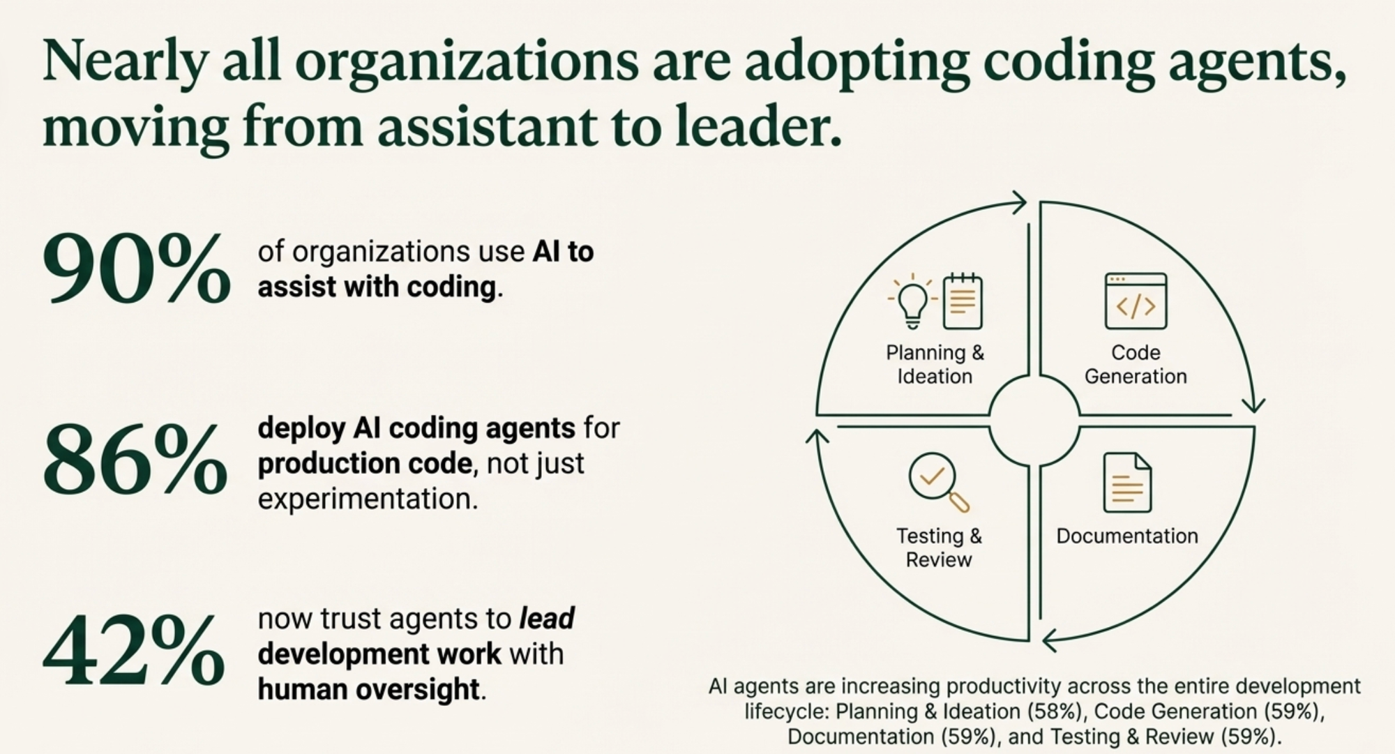 Nearly 90% of organizations use AI for coding. No surprise there. But here's what blew my mind: the productivity gains are almost evenly distributed across the entire software development lifecycle.