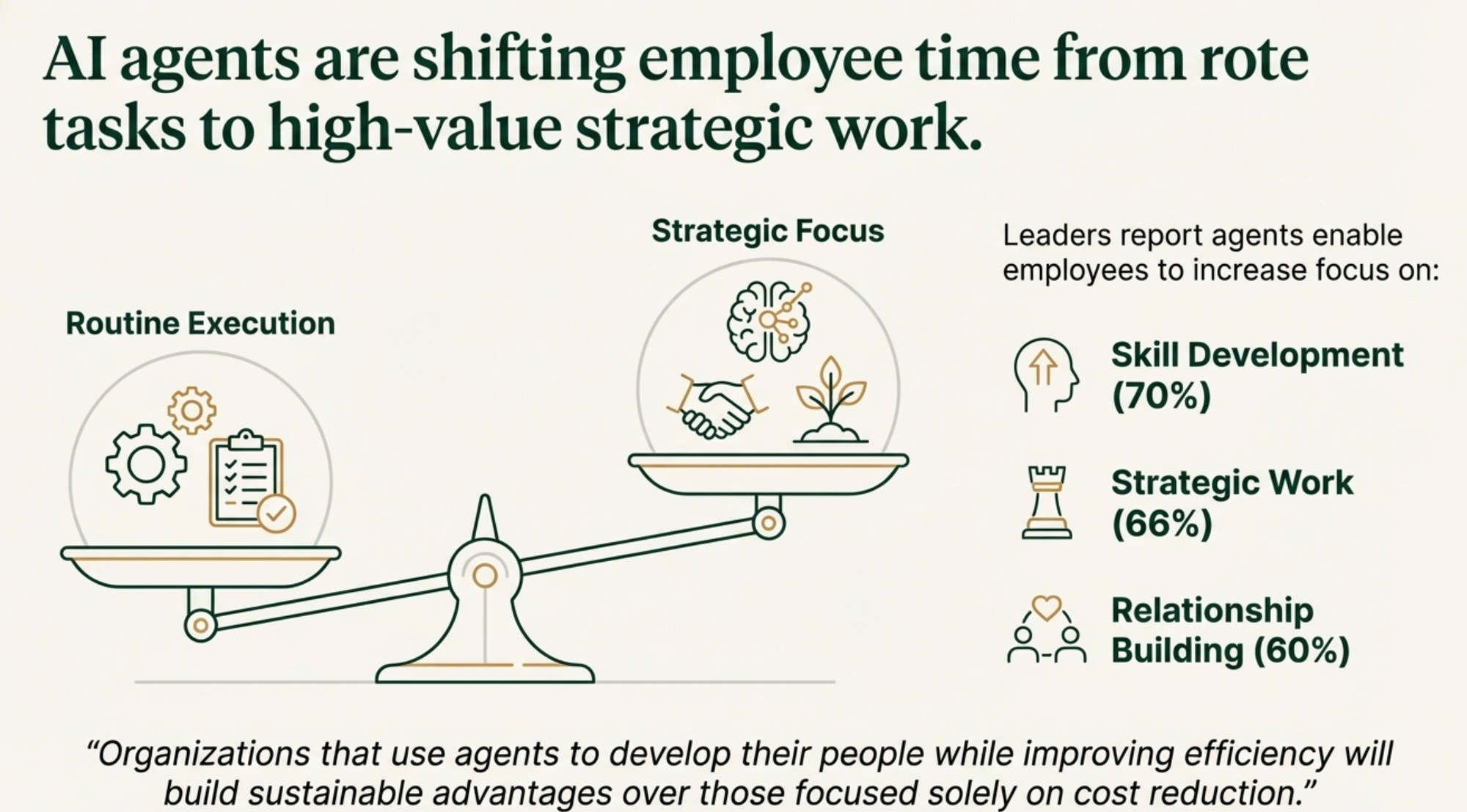 Organizations are reporting that AI is actually increasing the time employees spend on strategic work (66%), relationship building (60%), and skill development (70%).