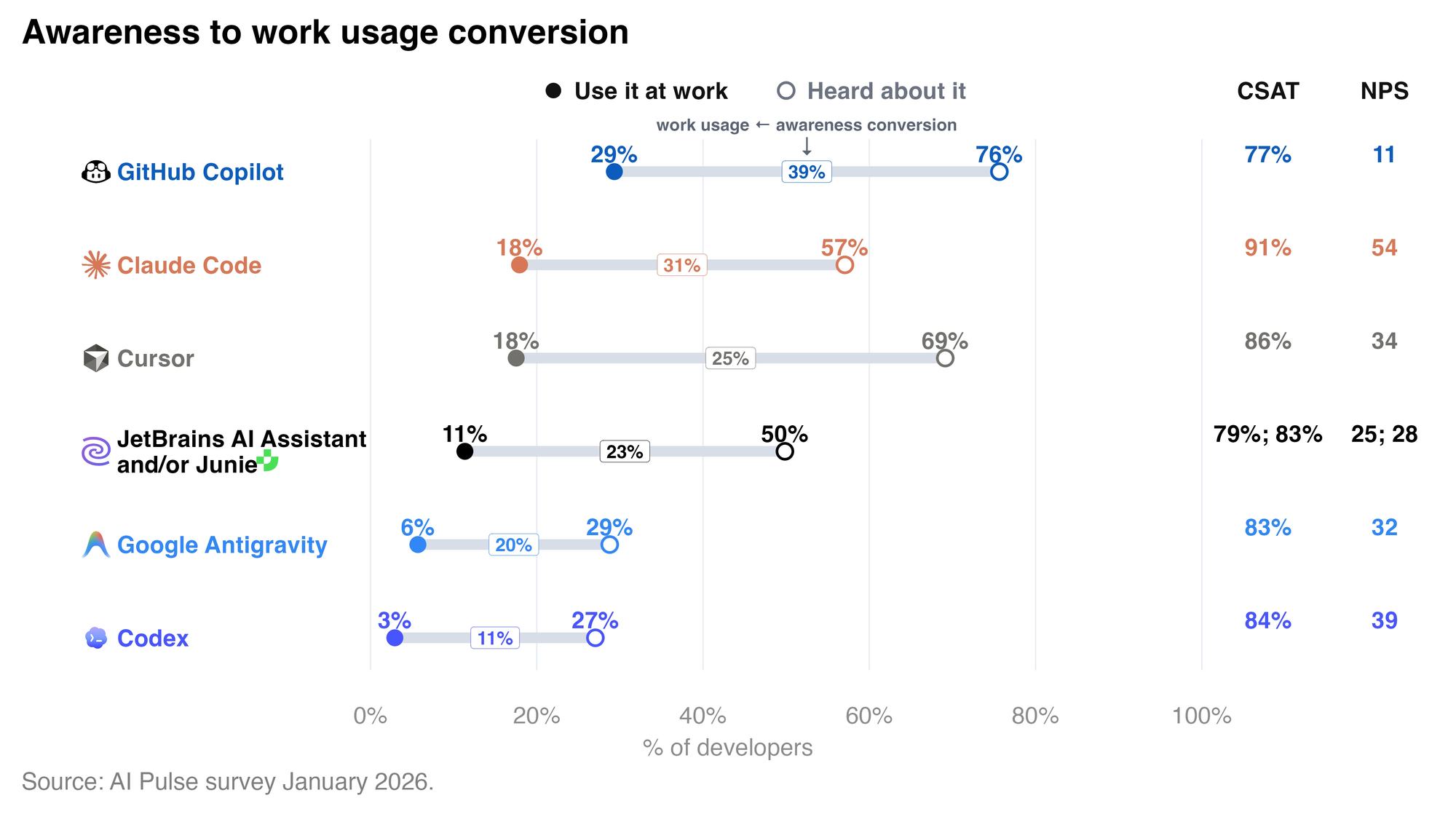 Satisfaction scores predict the next 12 months. Claude Code's 91% CSAT and 54 NPS are leading indicators that its 18% adoption number will keep climbing. Watch loyalty metrics, not just install counts.