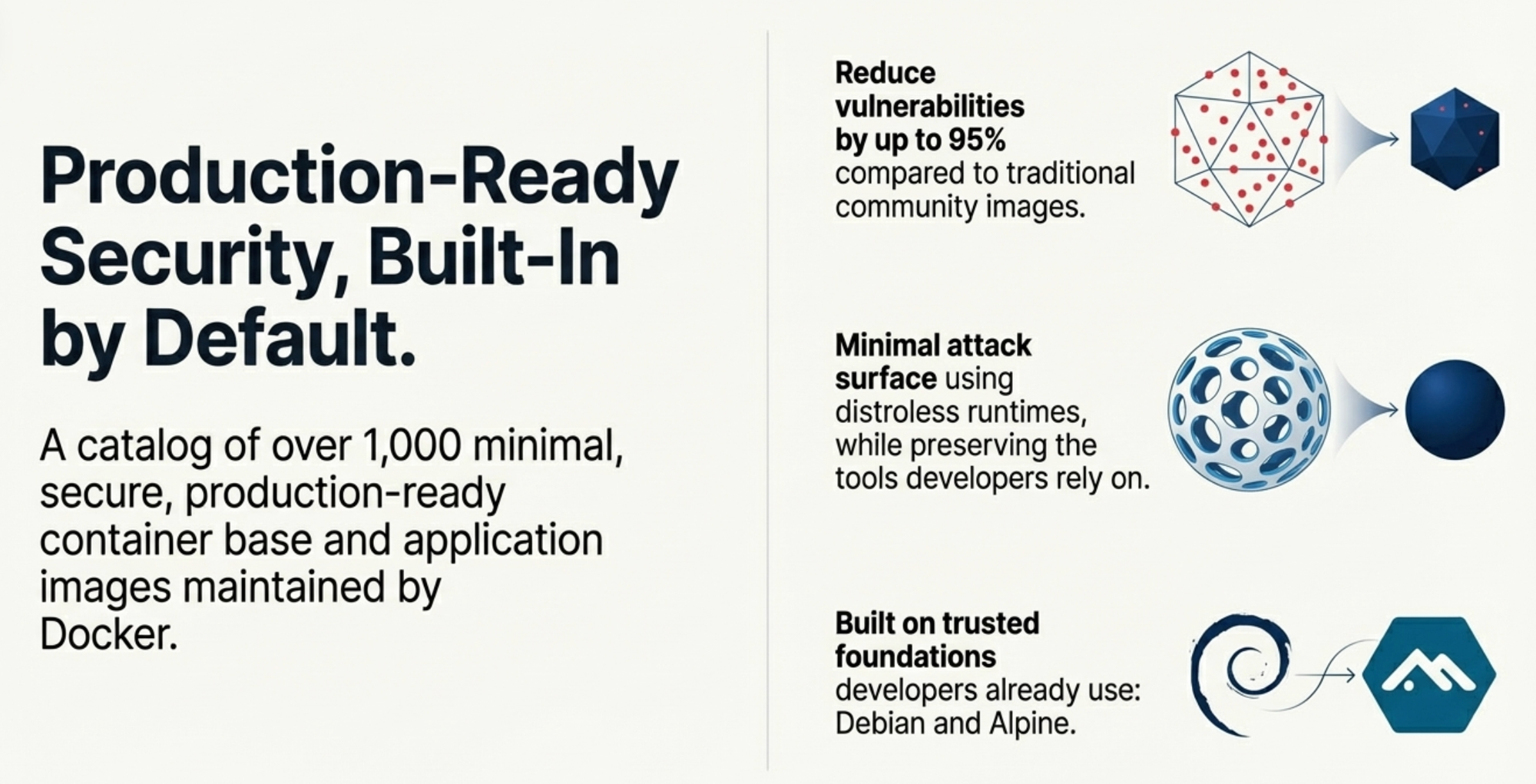 The images aren't static. Docker maintains them through an event-driven build system. When a vulnerability is discovered, patches roll out automatically. You get near-zero vulnerability postures without lifting a finger.