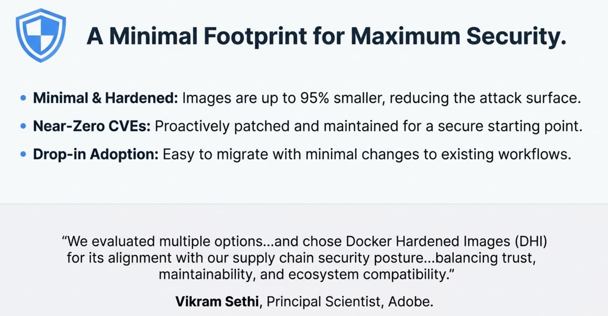 Docker just eliminated the excuse for insecure foundations. The hardened images are free. They're easy to adopt. They're maintained continuously. Security starts at the base layer. And now that base layer is accessible to everyone. From solo developers to Fortune 500 companies. From hobby projects to mission-critical infrastructure. The right thing to do is now the easy thing to do. That's how you change an industry.
