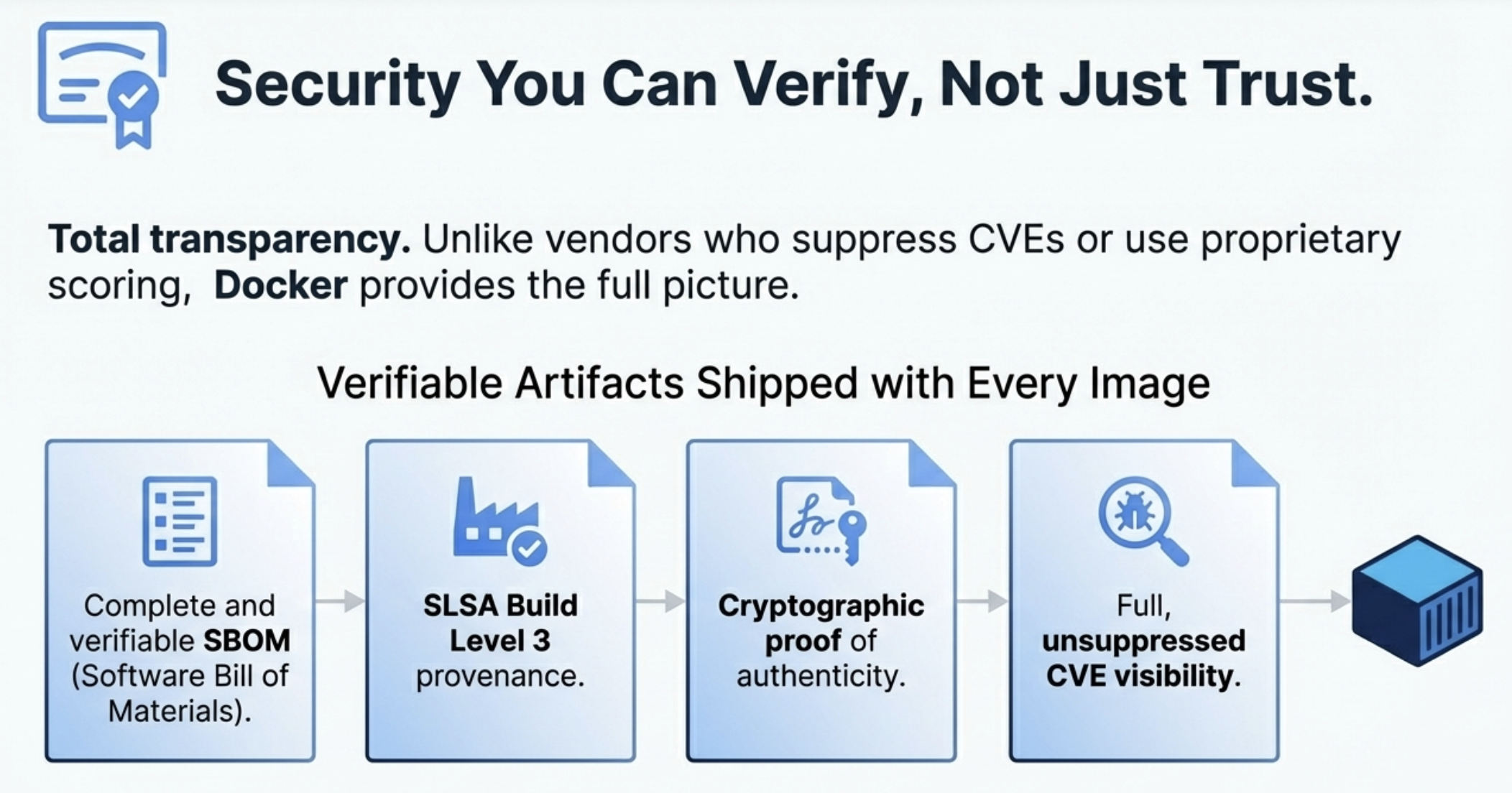Docker gives you 100% transparency. Every hardened image comes with three critical pieces of evidence: