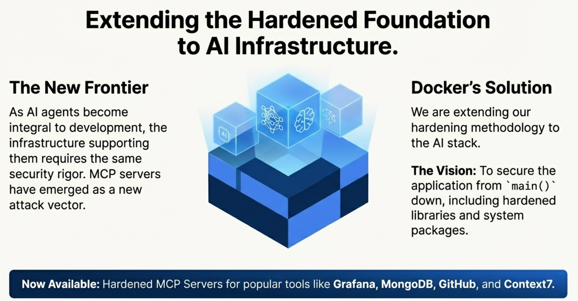 Docker applied the same hardening principles to MCP servers. Popular servers like MongoDB, Grafana, and GitHub now have hardened versions. Minimal footprints. Provenance attestations. Full transparency. This prevents data exfiltration. It blocks supply chain attacks in AI workflows. Your AI agents can be as secure as your applications.
