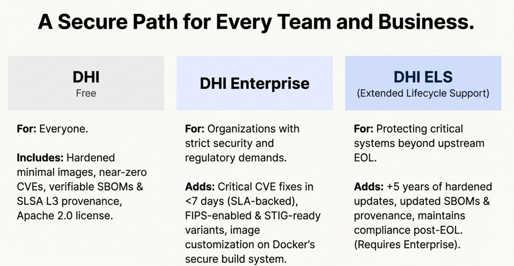 - Extended Lifecycle Support (ELS) When upstream distributions stop getting updates, Docker keeps patching.